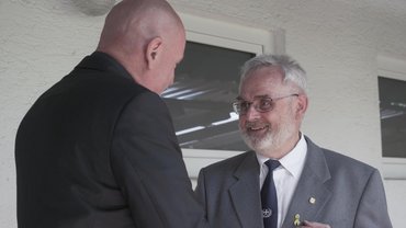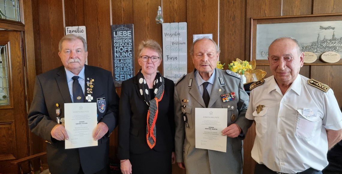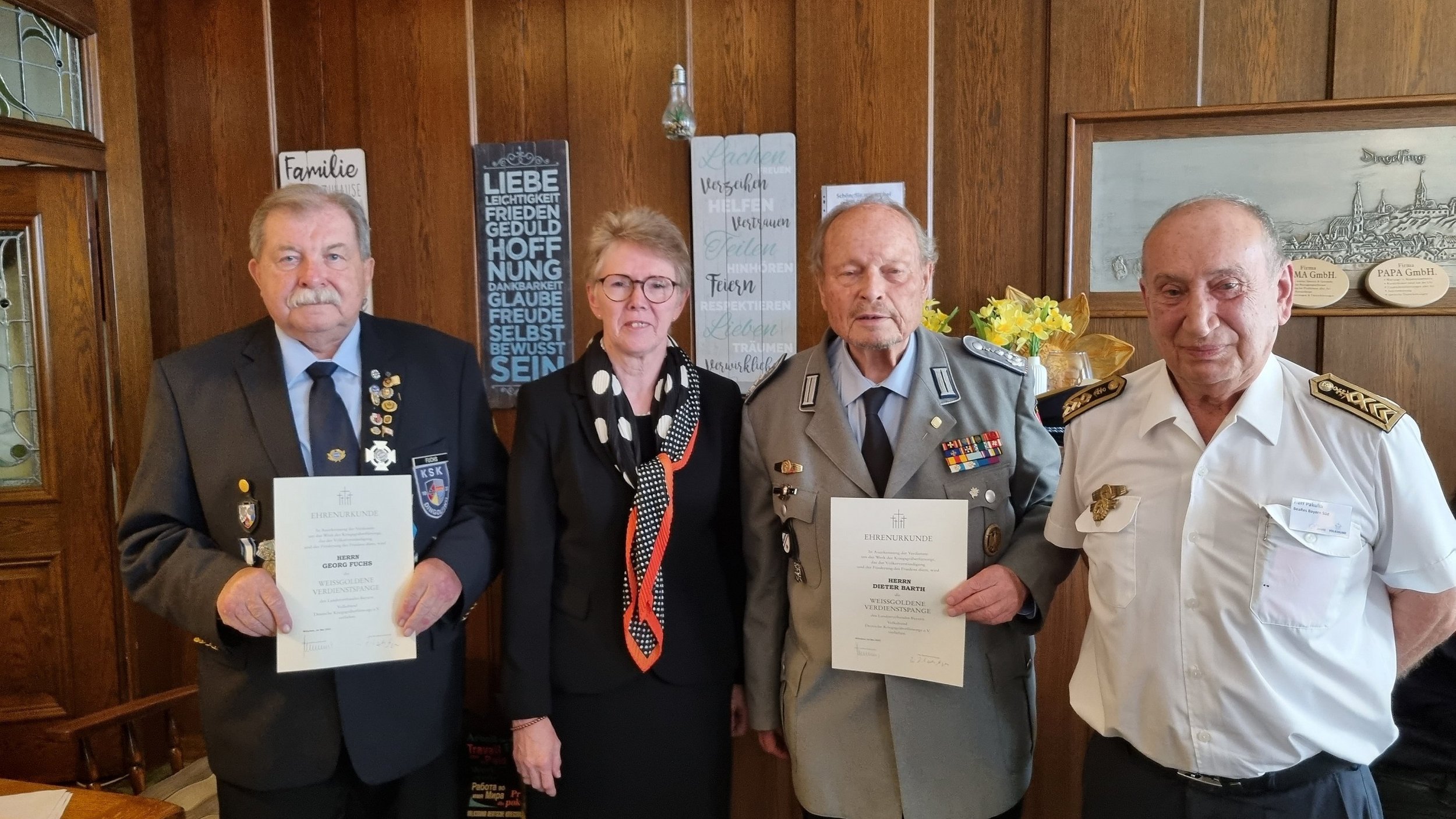 Mehrere hohe Auszeichnungen des Volksbundes wurden jüngst im Bezirksverband Niederbayern ehrenamtlichen Unterstützern des Volksbundes übergeben. Dr. Dieter Barth und Georg Fuchs von der KSK Dingolfing wurden für über 40-jährige Sammlertätigkeit für den Volksbund ausgezeichnet. Die Weißgoldene Verdienstspange verlieh der Reservistenbeauftragte des Landesverbandes Bayern, Klaus Pakulla im Beisein der 2. Bürgermeisterin Maria Huber.
