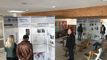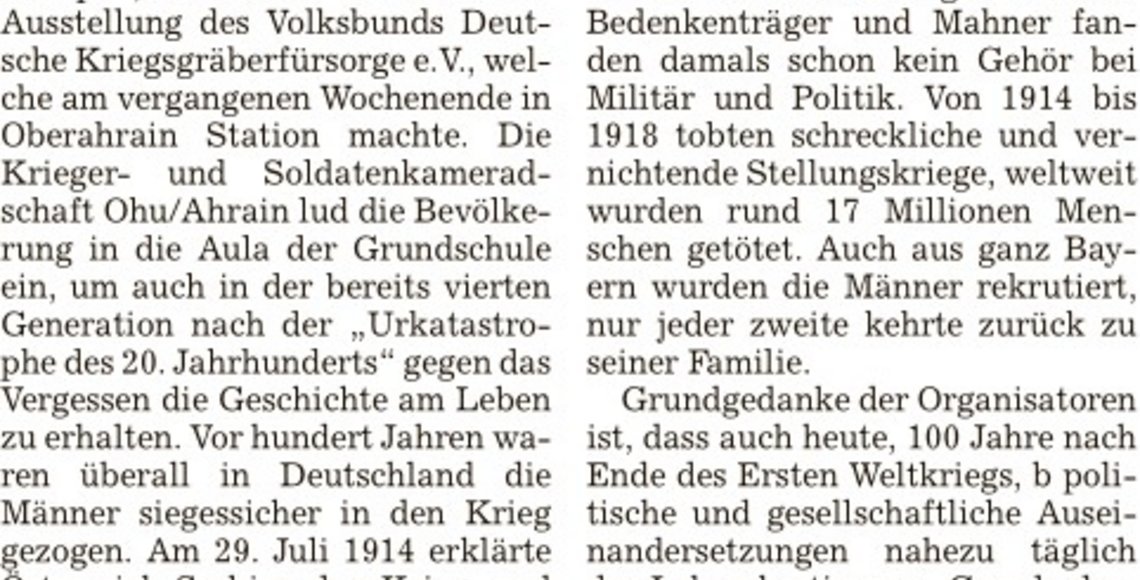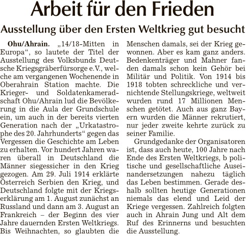 "14 / 18 - Mitten in Europa", so lautet der Titel der Ausstellung des Volksbundes, welche in Oberahrain (Niederbayern) Station machte. Zahlreich folgten in Ahrain Jung und Alt dem Ruf des Erinnerns und besuchten mit großem Interesse die Ausstellung. Das Elend und Leid des Krieges wurde anschaulich vergegenwärtigt und konnte die Besucher direkt und für ihr eigenes Leben ansprechen.